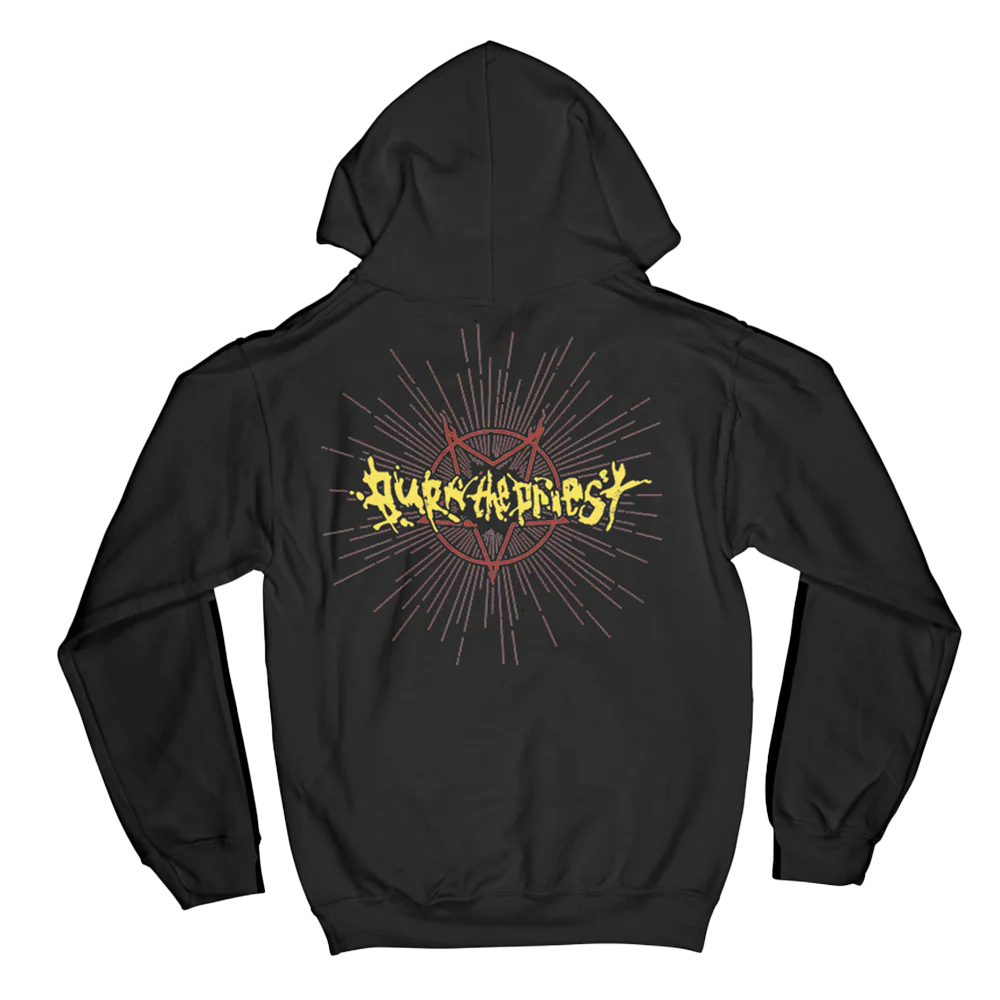 The Lamb Of God 'Burn The Priest' Logo Hoodie commemorates Lamb Of God's newest album with a vivid text design. This hoodie features the 'Burn The Priest' Logo on both the front and back.