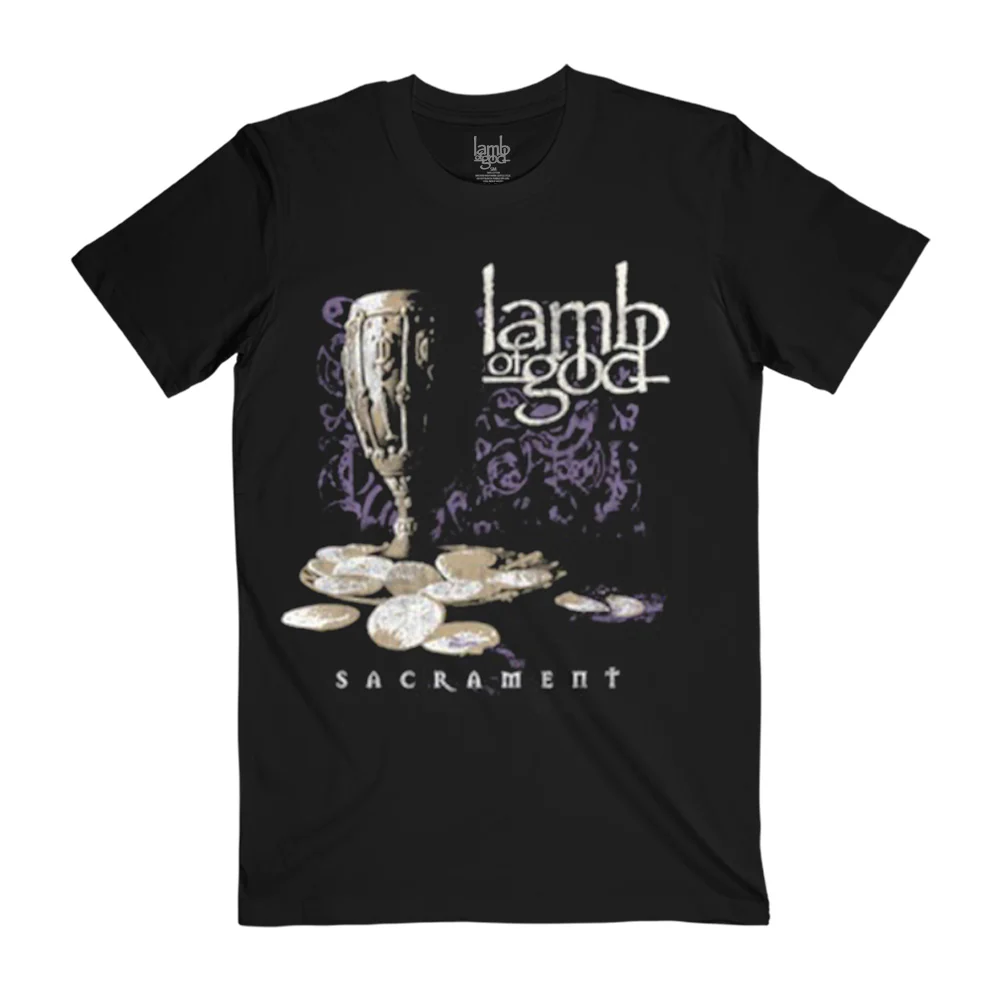 The Sacrament Vintage Tracklist Tee by Lamb of God celebrates Sacrament, originally released in 2006. Featuring artwork inspired by the album on the front and a complete track list on the back this tee is a faded grey/black garment for a vintage look and feel.